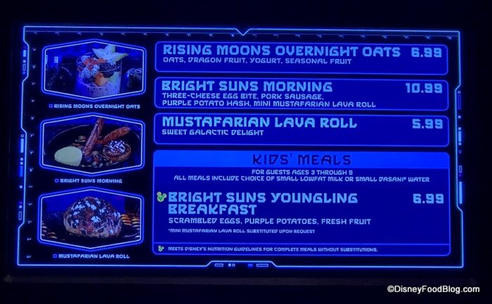 The Younglings version of the Bright Suns is a simpler affair than the adult version. It comes standard with Scrambled Eggs, Purple Potatoes, and Fresh Fruit. We substituted a Mini Mustafarian Lava Roll because breakfast dessert. 😉