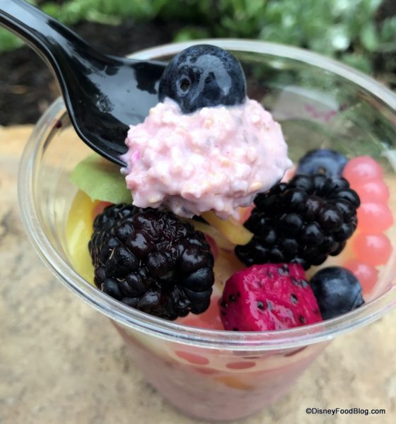 The fruit topping will be seasonal, but it’s expected always to contain some “otherworldly” dragon fruit. Other fruits on our visit included kiwi, mango, blueberries, and blackberries. What a comfort that they can grow some familiar fruits on Batuu, eh? 😉