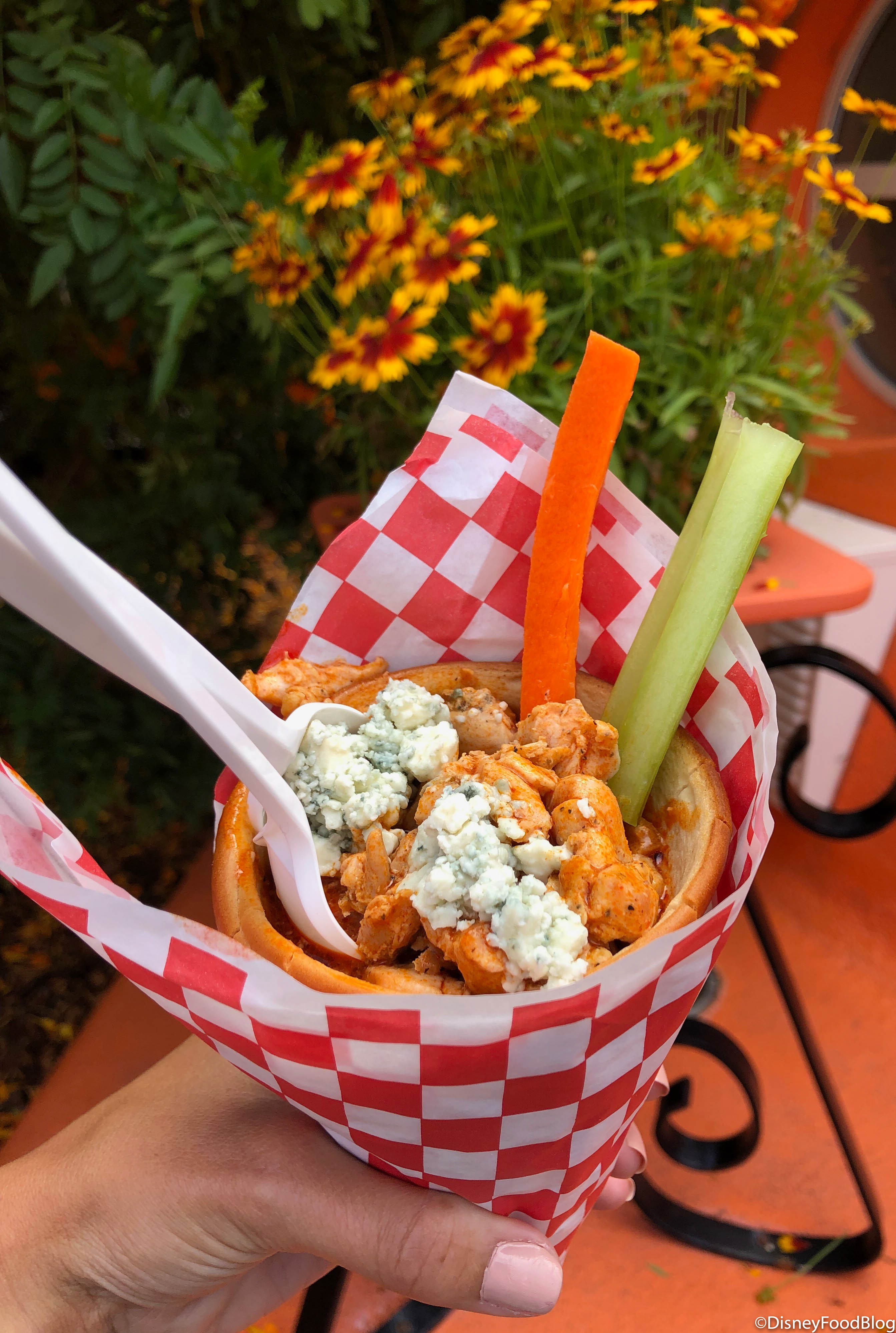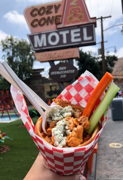 This cone is filled with spicy Buffalo chicken, creamy ranch dressing, carrots, and celery. And it’s topped with crumbled blue cheese.