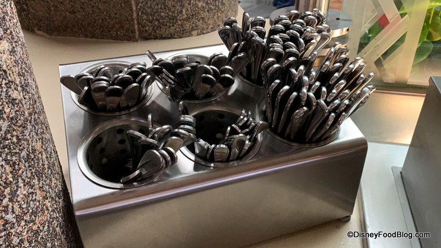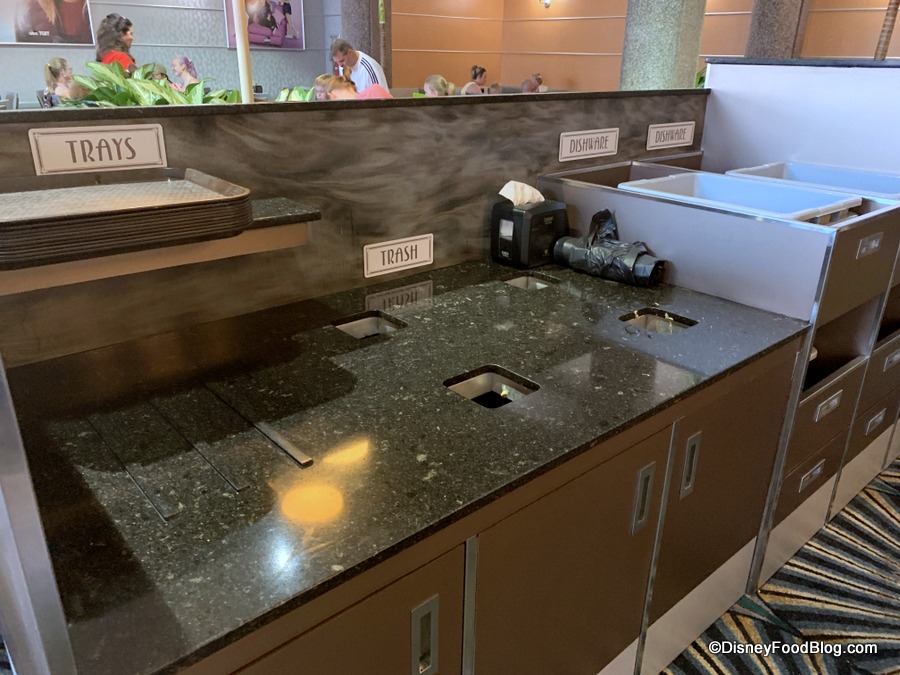 Note that there are stations in place for bussing your own table if you wish, but mainly since it is standard to do so during the regular lunch service. But Cast Members also collect plates and such in the dining area during dinner.