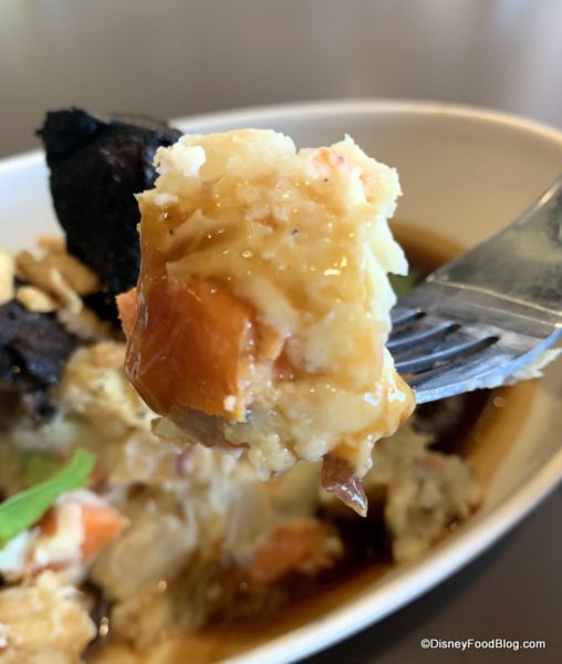 The new slow-cooked Pot Roast is served atop root-vegetable mashed potatoes with brown gravy and crispy onion straws. It’s plated on a ceramic dish as opposed to paper, which is a nice touch.