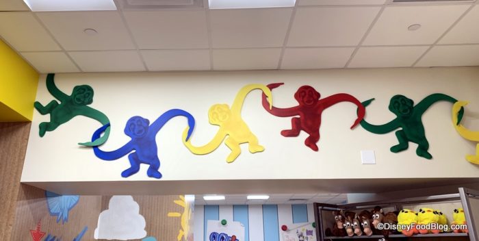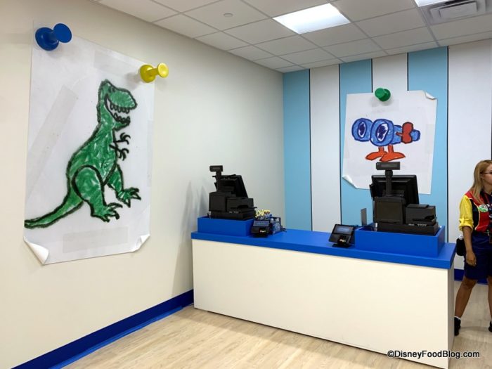 Like the rest of Toy Story Land, bright primary colors and larger-than-life toys (since we all shrink down to the size of a toy once we enter Andy’s backyard) set the scene at the Toy Story Mania Pop-Up Shop.