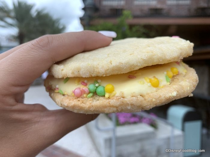 The Frozcato Sugar Cookie Sandwich has arrived in celebration of summer and will be available through the season for $8.00. However, one other thing has arrived with the summer… and that’s the famous Florida heat. So the one unfortunate thing here (as with many frozen treats enjoyed in Disney World) is that it melts quickly, so you’ll likely need to eat quickly as well.