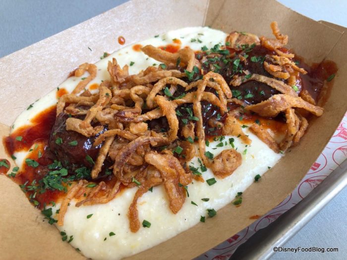 The next Shareable dish I ordered was new back in February (see our first review of them here!), and I had to get them again. Burnt Ends BBQ Meatballs with cheddar grits and Layla’s Sweet BBQ Sauce. I’m not actually sure which word I like most in the title of this dish.