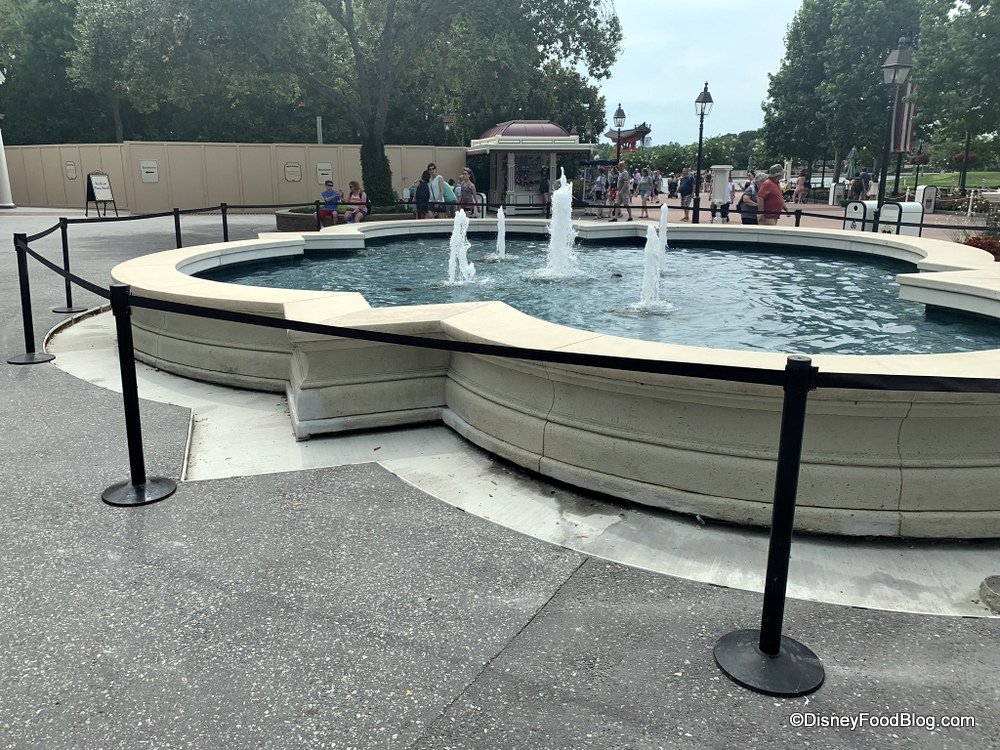 Construction is currently taking place in the American Adventure Pavilion, as the large fountain has been roped off for repaving work.