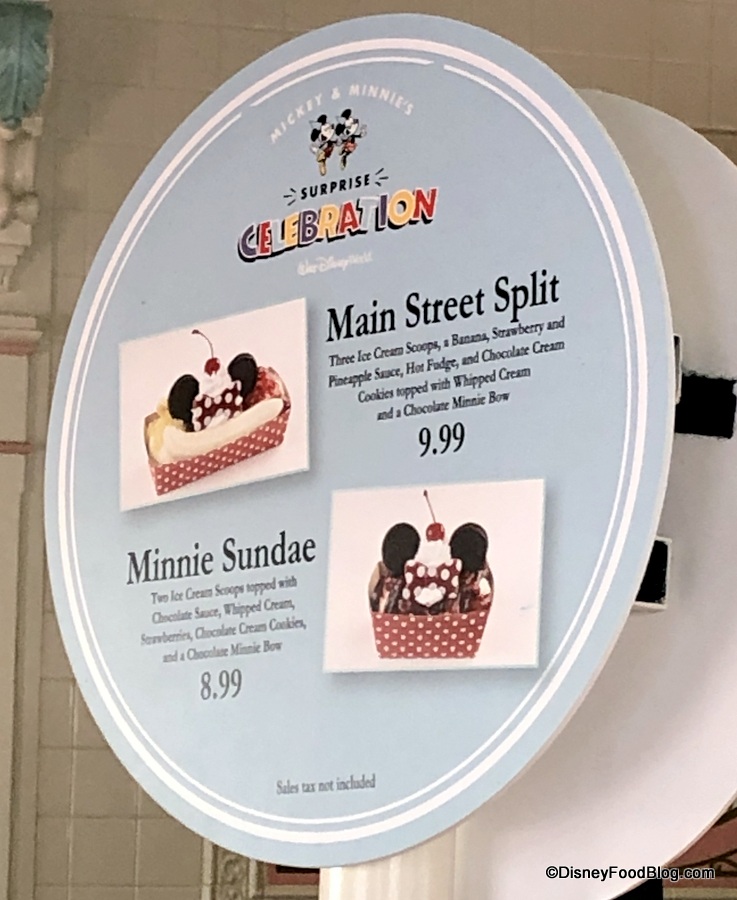 Main Street Plaza Ice Cream Parlor still offers two Surprise Celebration treats: the Main Street Split and the Minnie Sundae!