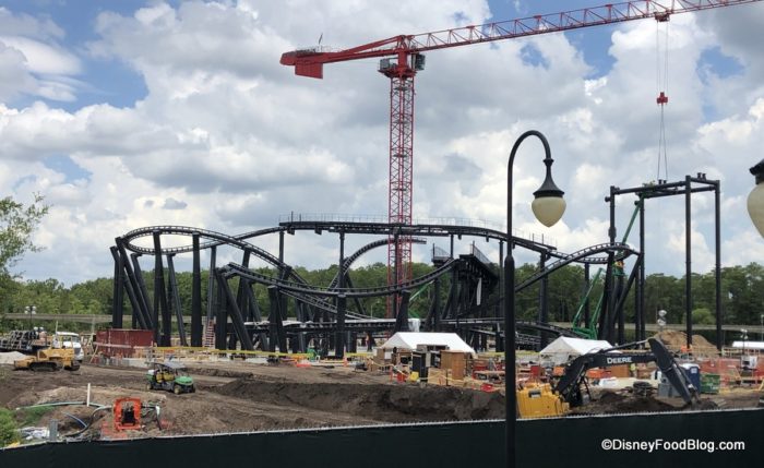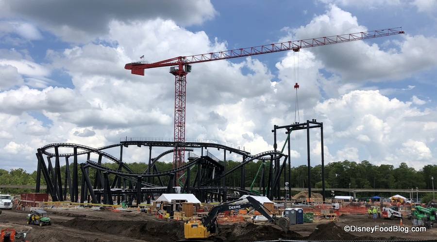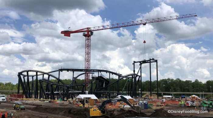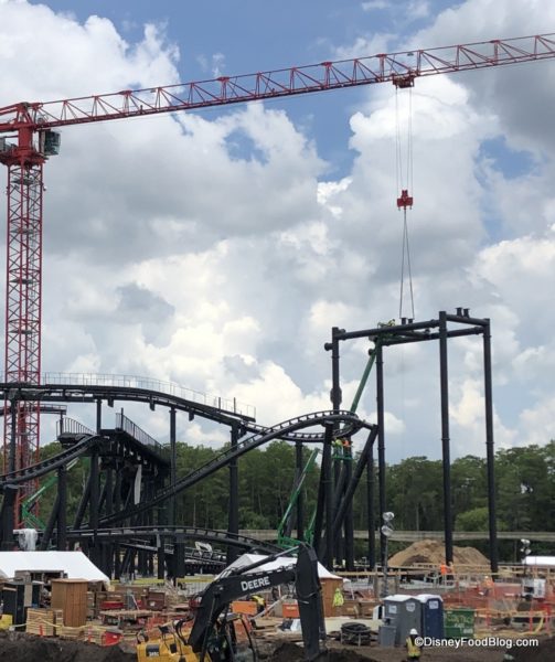 In Tomorrowland (but seen from Fantasyland’s Goofy’s Barnstormer), the Tron Coaster track continues to be set into place!