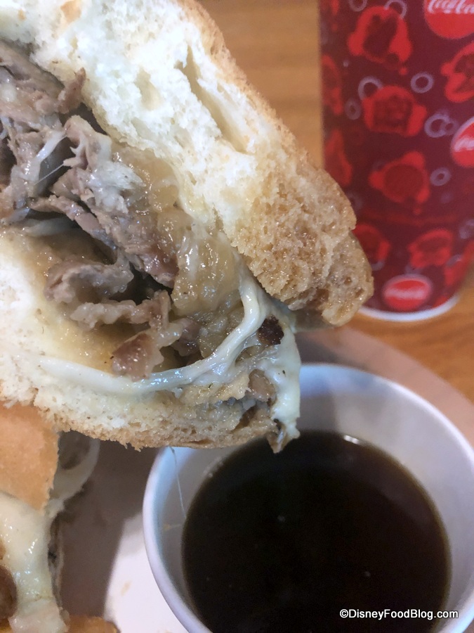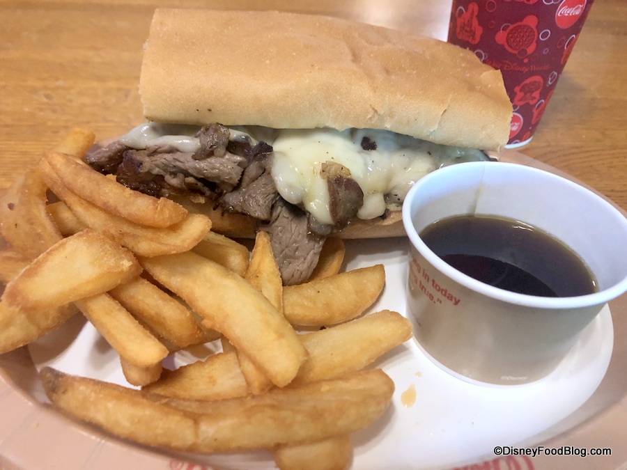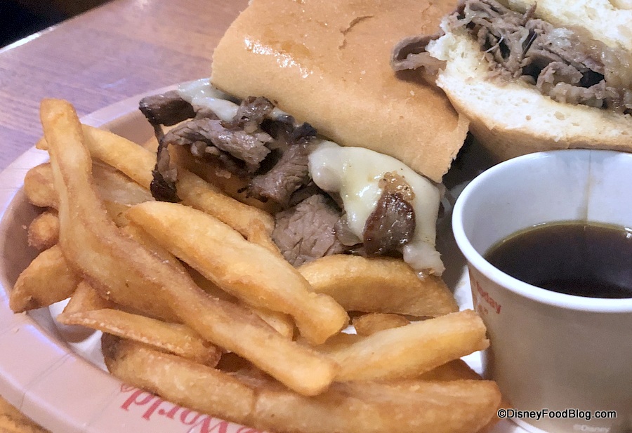 It’s served with warm au jus (not too salty, which is often our complaint) and loads of steak fries.