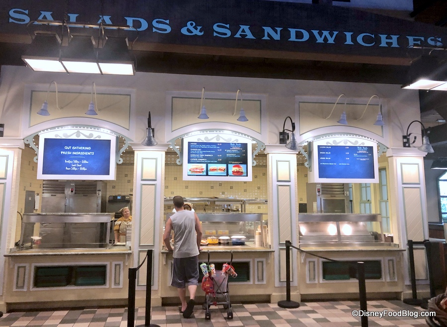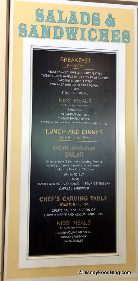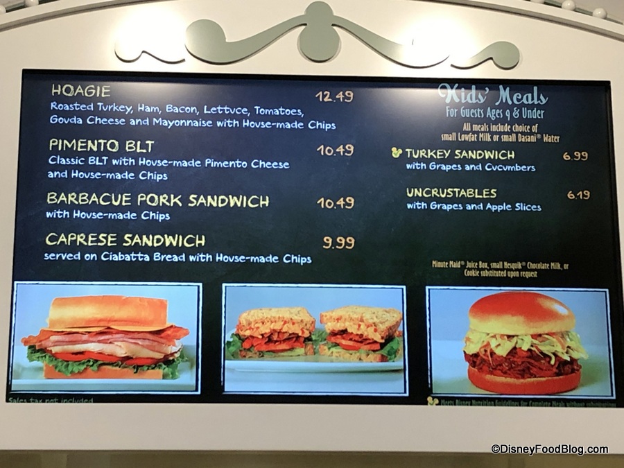 The electric menu boards over each station feature a few pictures to give you an idea of what to expect. As a general rule, these are some nicely staged food photos that are a little tidier than the actual product. But it’s still helpful! At the Salads and Sandwiches Shop diners find a Hoagie, Pimento BLT, Barbecue Pork Sandwich, and Caprese Sandwich. Kid sandwiches are available here, too.