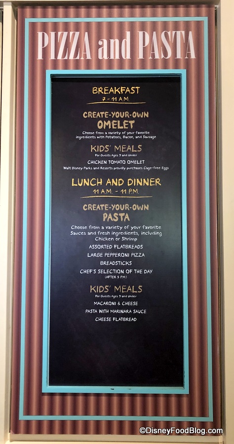 At the Pizza Shop, diners can choose from pizza, flatbreads, breadsticks, and pasta. Kids’ pasta dishes and pizza are also available.