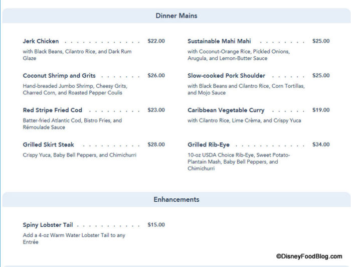 The Grilled Skirt Steak “Chimichurri” likewise remains; it’s simply called Grilled Skirt Steak now. And note that you can enhance your Dinner Main with a Lobster Tail.
