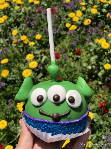 Bing Bong’s Sweet Stuff on Disney California Adventure Park’s Pixar Pier has Alien Caramel Apples. These animated offerings include a couple of marshmallow ears, three bright eyes, and blue and purple sugar bottoms.