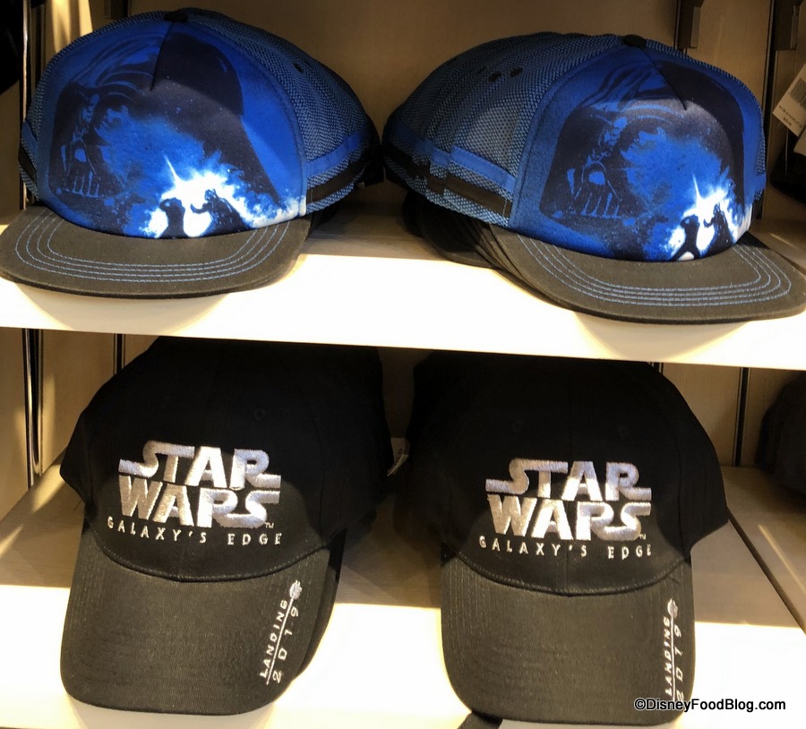 There are several hat designs on display including this dramatic Vader cap.