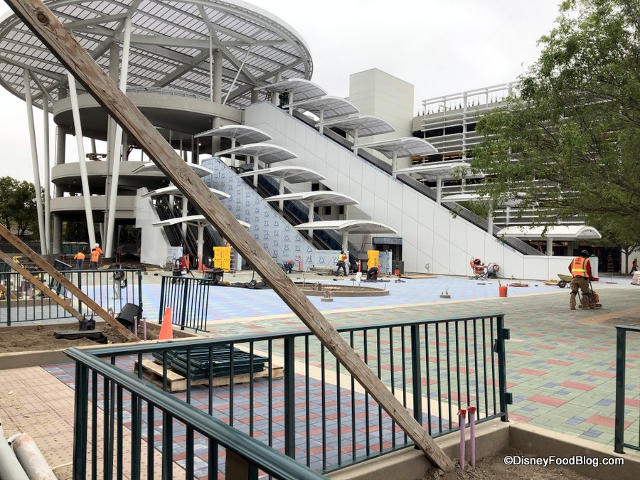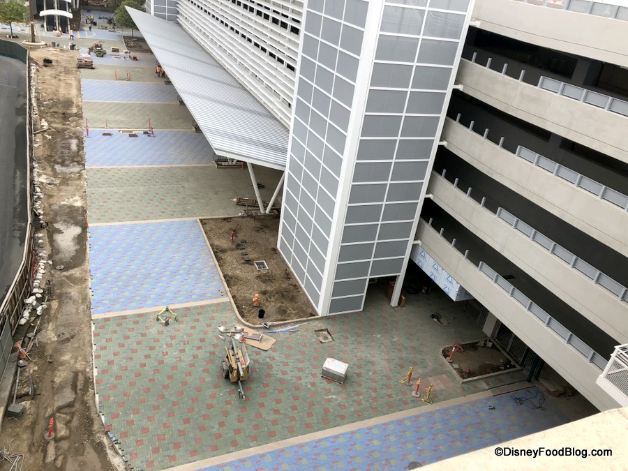 is coming along! This massive parking garage will open this summer, and now work on the colorful pavers seems nearly complete.