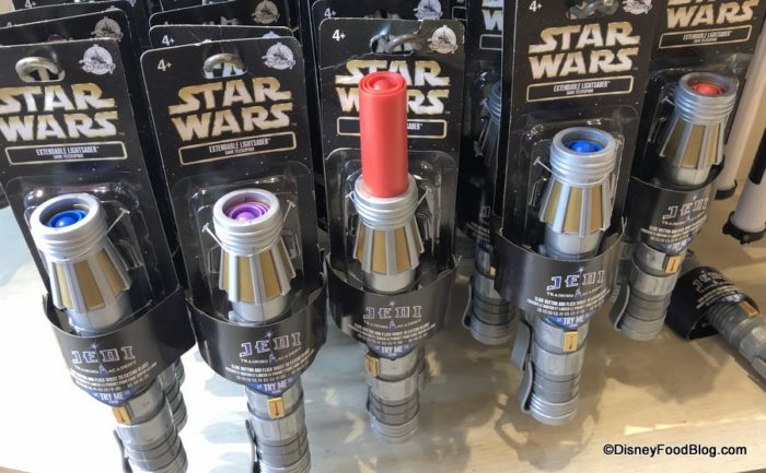 And if you just couldn’t drop two hundo at Savi’s Workshop — Handbuilt Lightsabers, World of Disney has a couple cheaper, plastic options. These ones are retractable for easier transport and drama. 😉