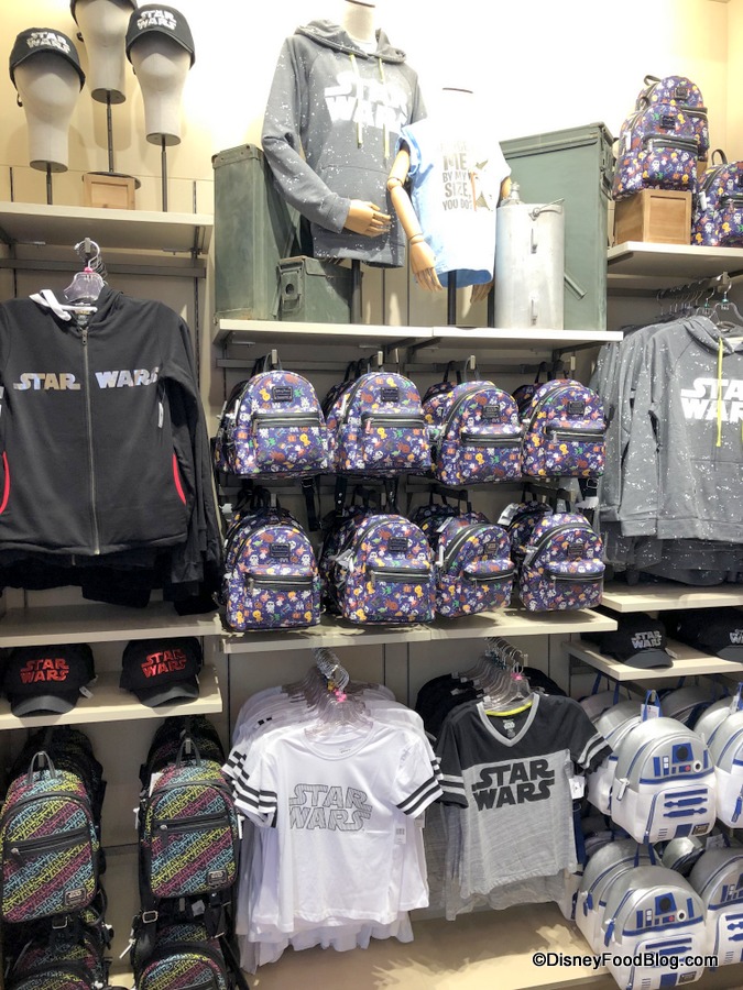 This display features some great sweatshirts and hats — plus three Loungefly backpack designs!