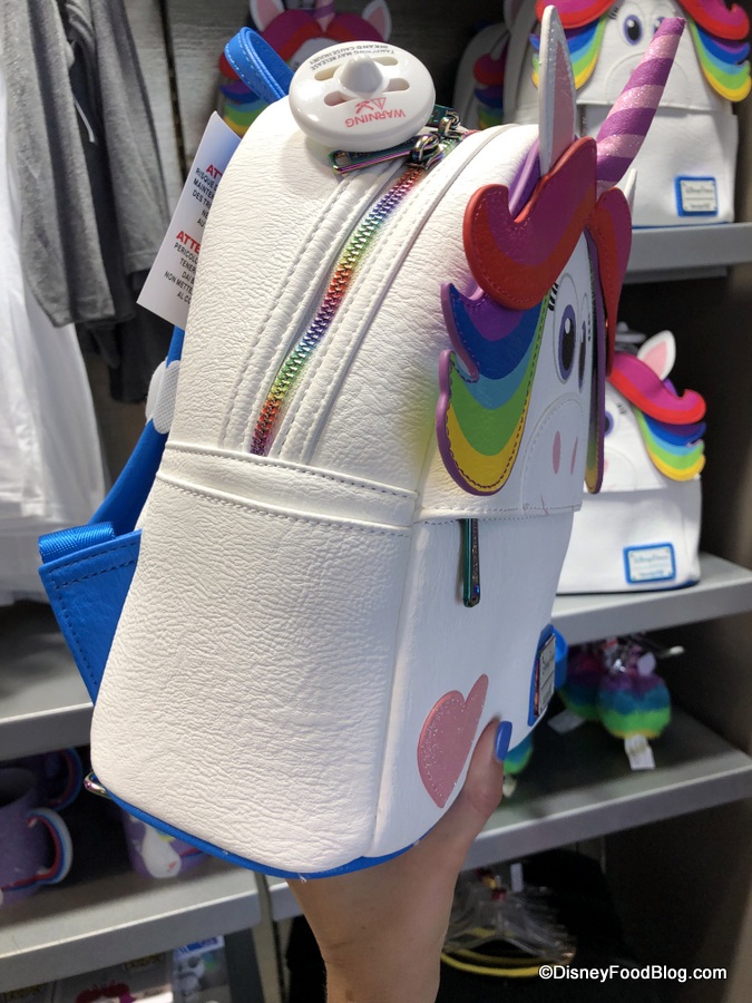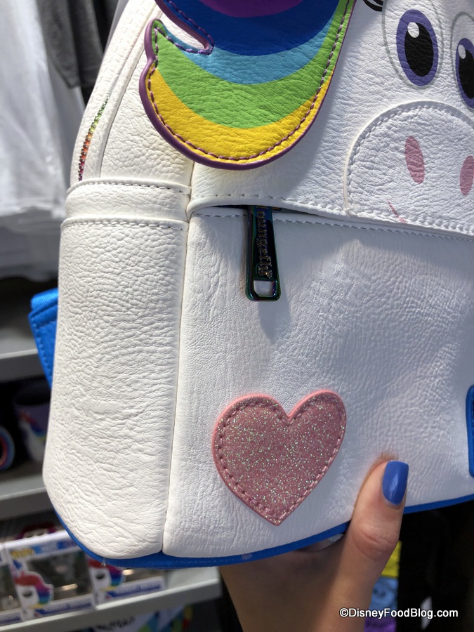We saw the Rainbow Unicorn Loungefly Backpack today in Disney’s Hollywood Studios… because it’s impossible NOT to spy this colorful bag, right down to the detailed rainbow zipper and sparkly heart patch.