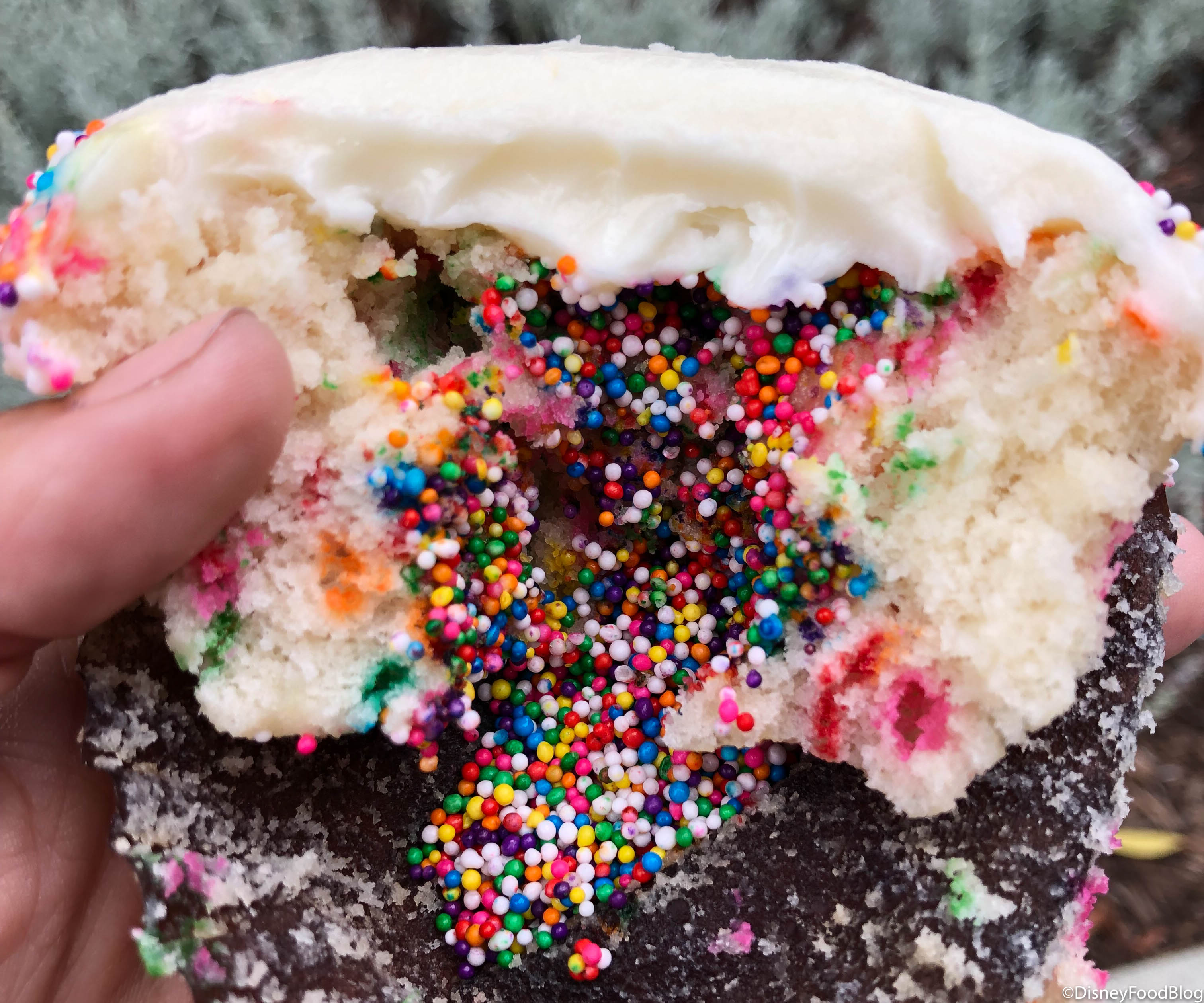 The cupcake itself is a birthday cake flavored cupcake (it tastes a lot like vanilla cake batter) filled with even more colorful sprinkles!