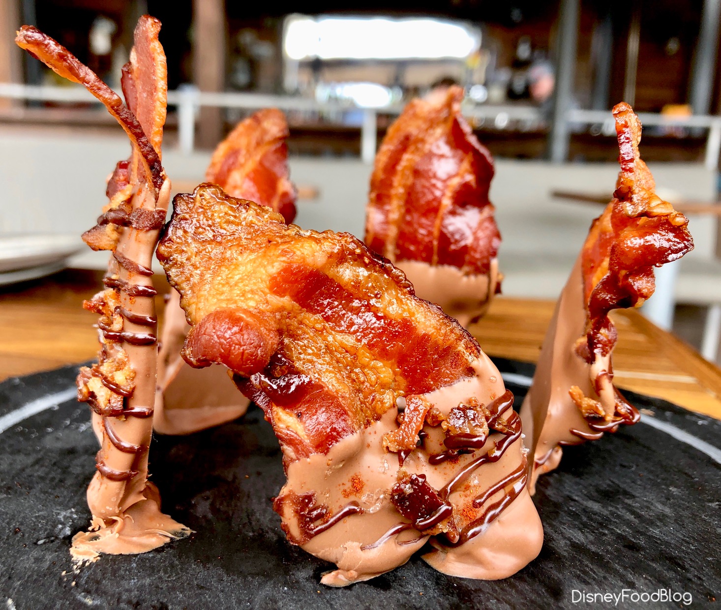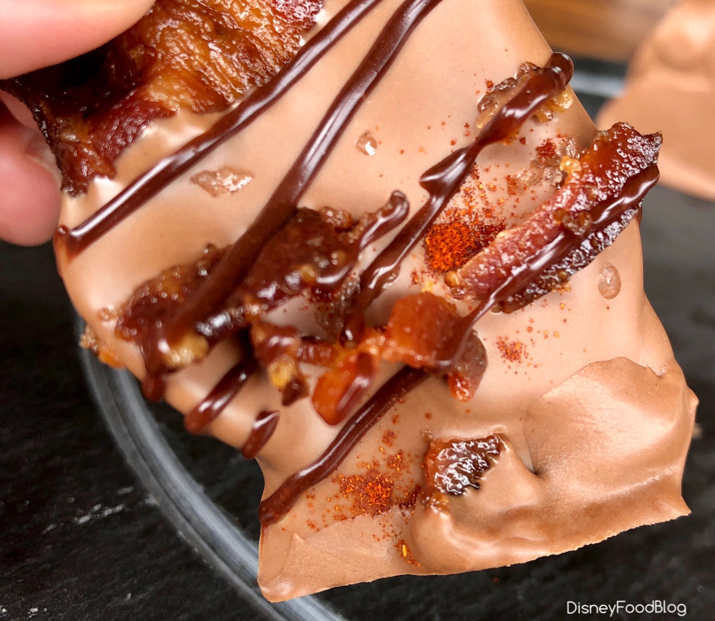 You know this is right up our alley, right?? Thick-cut Applewood Smoked Bacon is doused in Ganachery Milk Chocolate, AND drizzled with Chipotle Ganache (that’s the dark chocolate drizzle there). We also spotted some cayenne pepper and salt sprinkled on ours that wasn’t listed in the description!