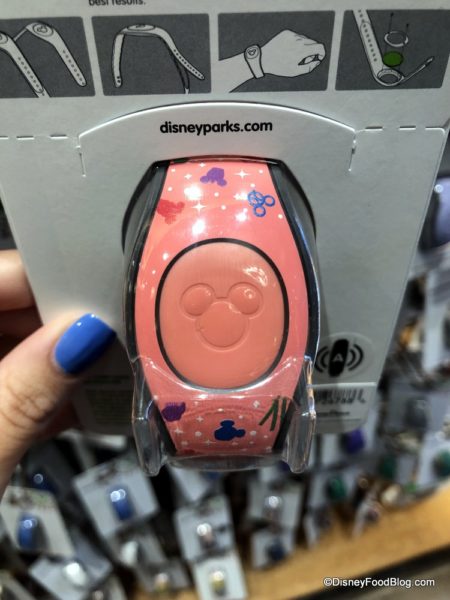 The MagicBand is a pretty pink color with a swirly Dole Whip Float on the back. Icons of other popular Disney World snacks cover the MagicBand as well.