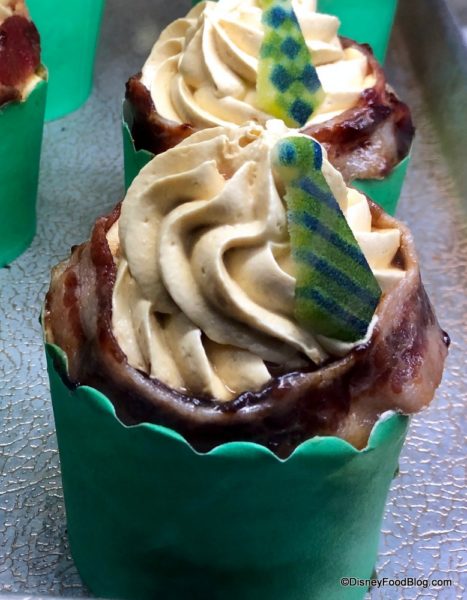 This chocolate cupcake is filled with caramel buttercream and topped with MAPLE BACON, maple buttercream, and a gummy tie! The All-Star resorts have been slaying the cupcake game lately.