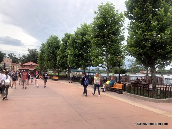 Wrapping up our walk around World Showcase, we noted the ongoing construction surrounding the International Gateway. Quite a bit of this construction is due to the upcoming Skyliner transportation system. Once the Skyliner opens this fall, it will drop off and pick up guests from this location.