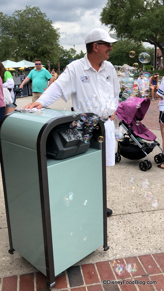 Finally, we couldn’t resist taking a photo of a friendly Cast Member making trashcan bubbles! This was outside Pin Traders and kids were loving it!