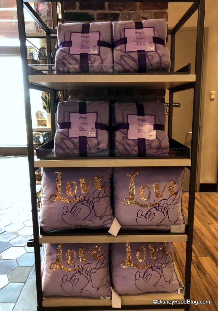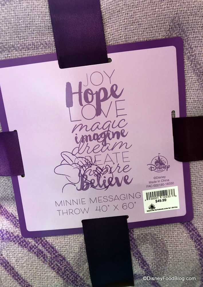 We also noticed a pastel purple Minnie Messaging throw ($49.99) and pillow ($34.99). We hadn’t seen these before and thought they were super cute!