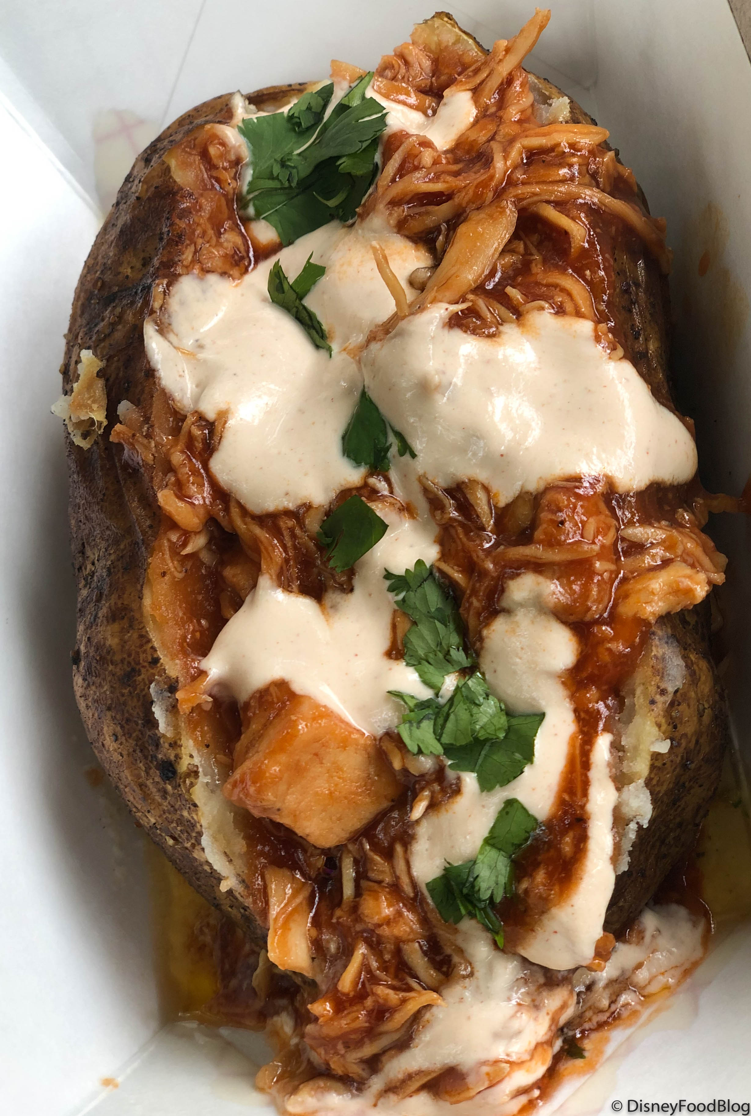 The BBQ Chicken Stuffed Baked Potato ($8.49) is filled with BBQ chicken, butter, chipotle sour cream, and cilantro.