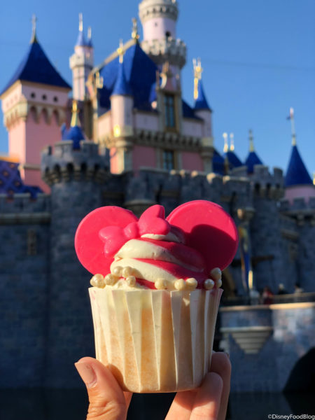 The Imagination Pink Cupcake ($4.99) is a vanilla cake topped with raspberry cream frosting, chocolate pearls, and really cute Minnie ears.