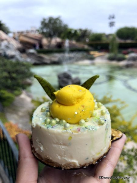 The last sweet treat we tried at Jolly Holiday was the Tinkerbell Coconut Cheesecake ($5.79). From the buttercream bun to the white chocolate wings, we can’t get over how cute this dessert looks!
