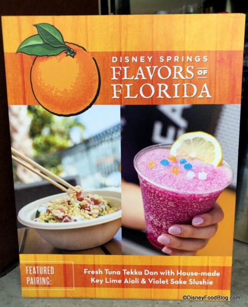 The featured Flavors of Florida items here include a Fresh Tuna Tekka Don and the Violet Sake Slushie.