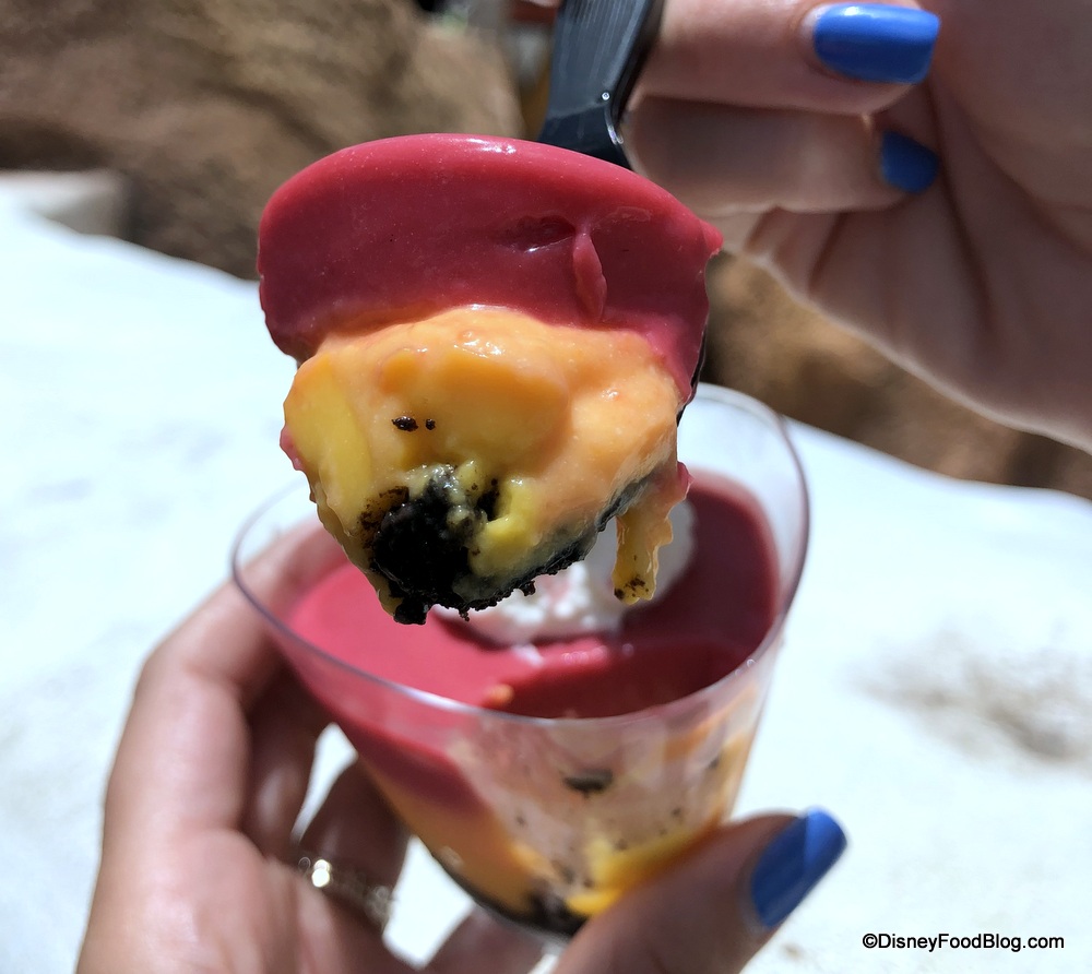 The No Worries Panna Cotta consists of layers of raspberry, papaya, and mango panna cotta, with a cookie crumble base and a Lion King white chocolate piece.