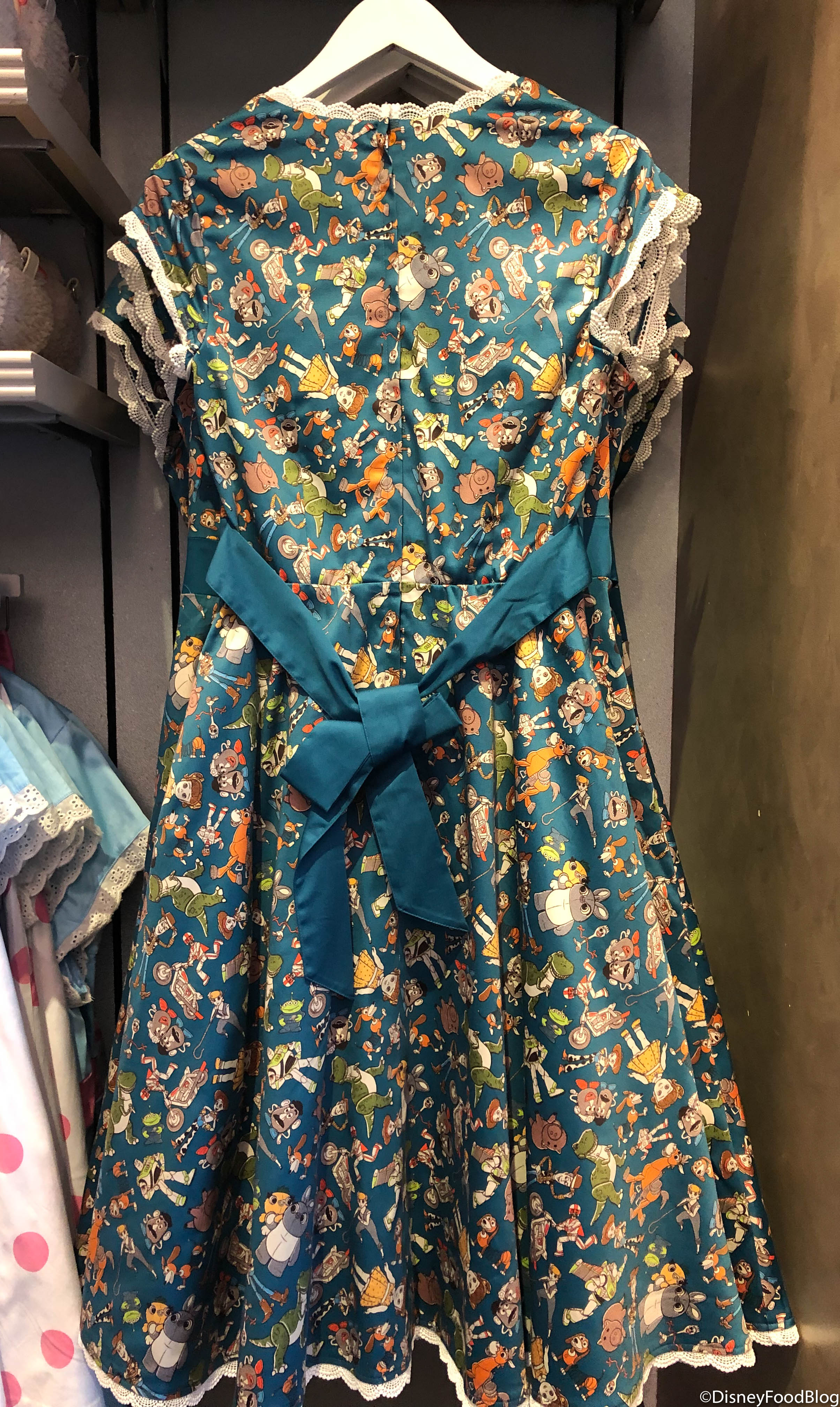 The dress is a dark green-bluish color and has the most adorable lace trim. We love the print as it is covered in friends both old and new like Woody, Bo Peep, Forky, and more.