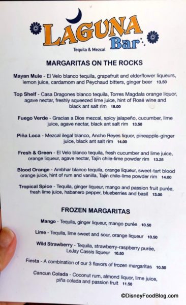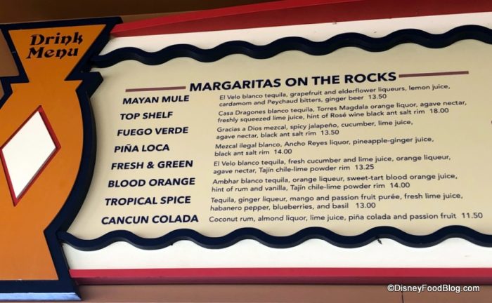 But the Margaritas on the Rocks include unique options such as the Fuego Verde Margarita featuring Gracias a Dios Mezcal, Jalapeño, Cucumber, Fresh Lime Juice, Agave Nectar and a Black Ant Salt rim, which you’ll also find at Choza de Margarita in Epcot!