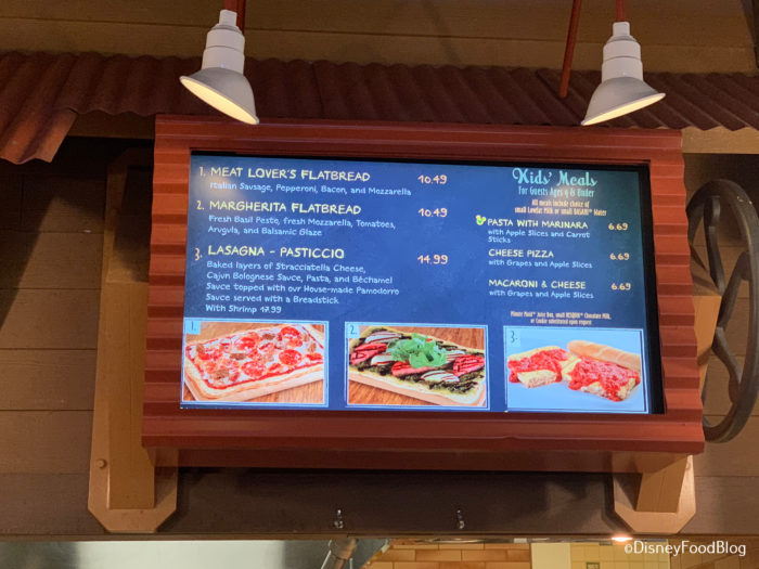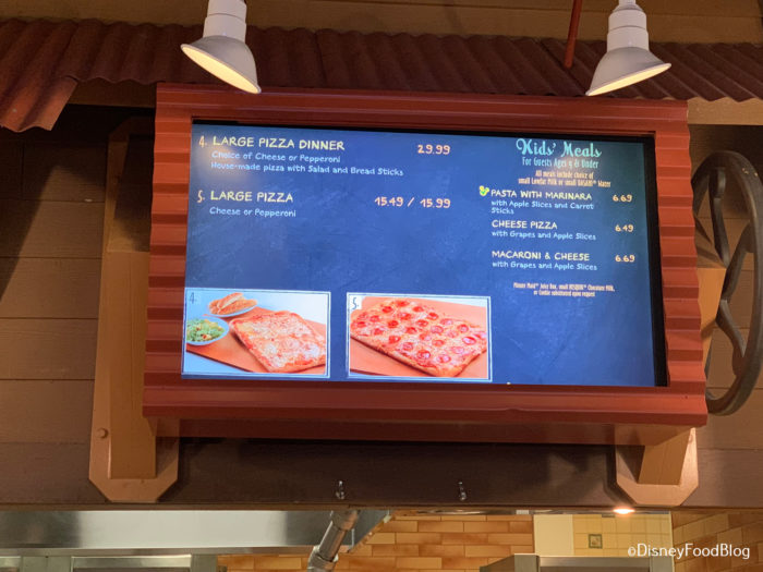 We did notice a Large Pizza DINNER was added to the menu. This comes with your choice of a Large Pepperoni or Cheese Pizza, plus House-made Salad and Breadsticks. We confirmed with the Cast Members that this is still a Quick Service Meal credit on the Disney Dining Plan, and can be paired with either two desserts OR two drinks.