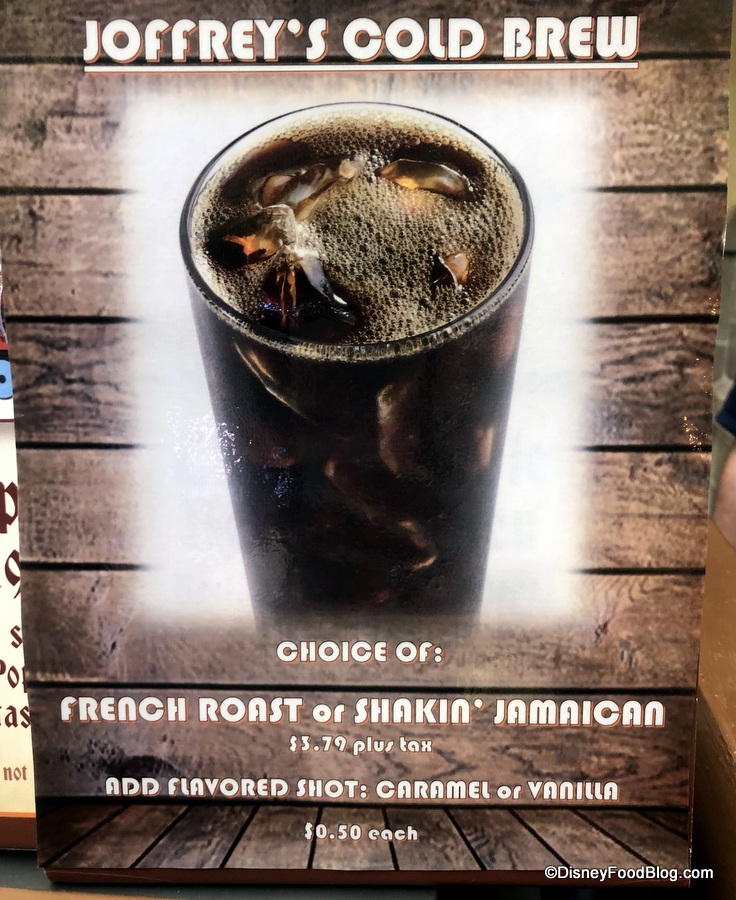 If you need to cool off when you’re in Magic Kingdom (and you probably will — it’s HOT out there, folks!), you can currently grab a Joffrey’s Cold Brew Coffee — with an added flavor or without — at Pinocchio Village Haus.