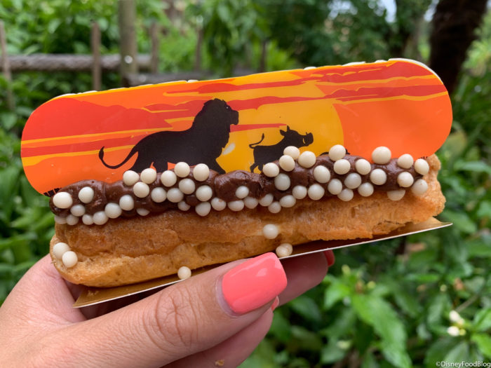 The Mara is a quick service location inside Animal Kingdom Lodge that serves options like flatbreads, fried shrimp, and hamburgers. When stopping by today, we noticed that the Giraffe Eclair and the Kudu Cookie Sandwiches — which you can read a review for here — were sporting new Lion King decorations.