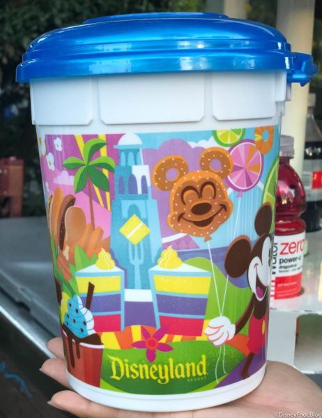 But Disney also frequently releases classic popcorn buckets, like this adorable new one spotted in Disneyland that’s covered in classic Disney snacks! (You might recognize this design; it’s similar to the Walt Disney World snack bucket we spotted last year!)