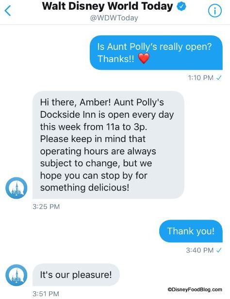 A team member has since reached out to @WDWToday and was told Aunt Polly’s is indeed open the week of July 4th. However, we have not been able to confirm this news ourselves.