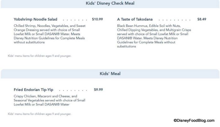 Disneyland’s Felucian Garden Spread is nowhere to be found on Disney World’s menu. We’re hoping this is a glitch and that it will be added, as it’s a favorite of guests at Docking Bay in Disneyland — featuring Impossible Meatballs and naan bread.