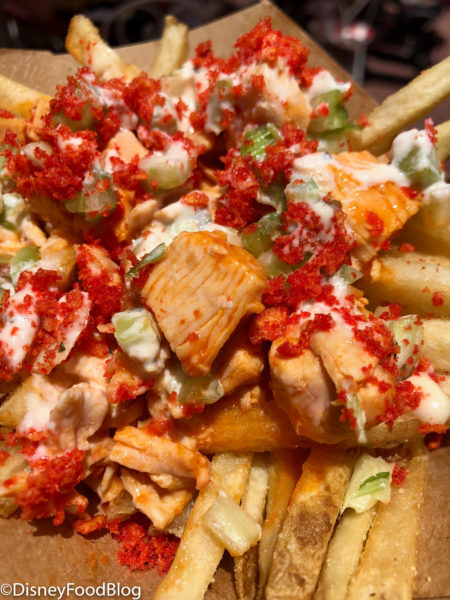 We don’t know how long they’ll stick around (usually around a month — we think they’re back for the 4th of July festivities along with a few other spicy, limited time options), but you can purchase the Buffalo Chicken Loaded Fries for $6.49 or the use of a snack credit on the Disney Dining Plan. Want to raise the temperature EVEN MORE? You can sprinkle jalapeños from the toppings bar on this snack for some extra heat.