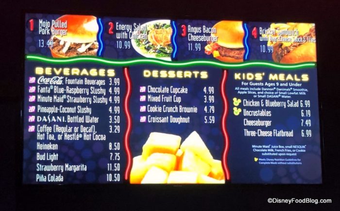 Kids’ Meals include the Mickey Check Chicken and Blueberry Salad, the Mickey Check Uncrustables, a Cheeseburger, and the Three-Cheese Flatbread. These are served with a Dannon Danimals Smoothie, Apple Slices, and a drink. Juice, French Fries, and a Cookie can be subbed by request.