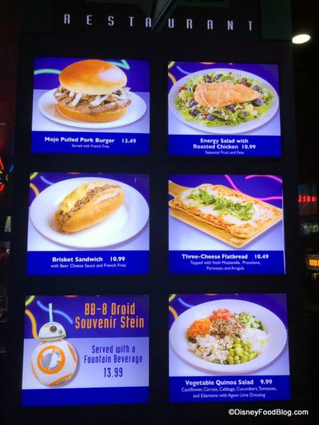 I dined with my son on this visit, so we’re taking a look at both the regular and the kids’ menu. Options for adults include some items that may be a little surprising in a counter service spot, including a Vegetable Quinoa Salad (which replaced the Veggie Naan Wich we liked here!) and a Mojo Pulled Pork Burger (which, hello, protein — see it here!).