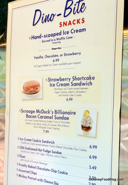 Dino-Bite Snacks has a frozen treat you don’t need a Stacking Cup to enjoy: Scrooge McDuck’s Billionaire Bacon Caramel Sundae. We’ve seen this before (again, during the Tasting Sampler in April), and it’s waddled back onto the menu for the time being. Click here to read if a sundae with bacon and caramel is all it’s quacked up to be.
