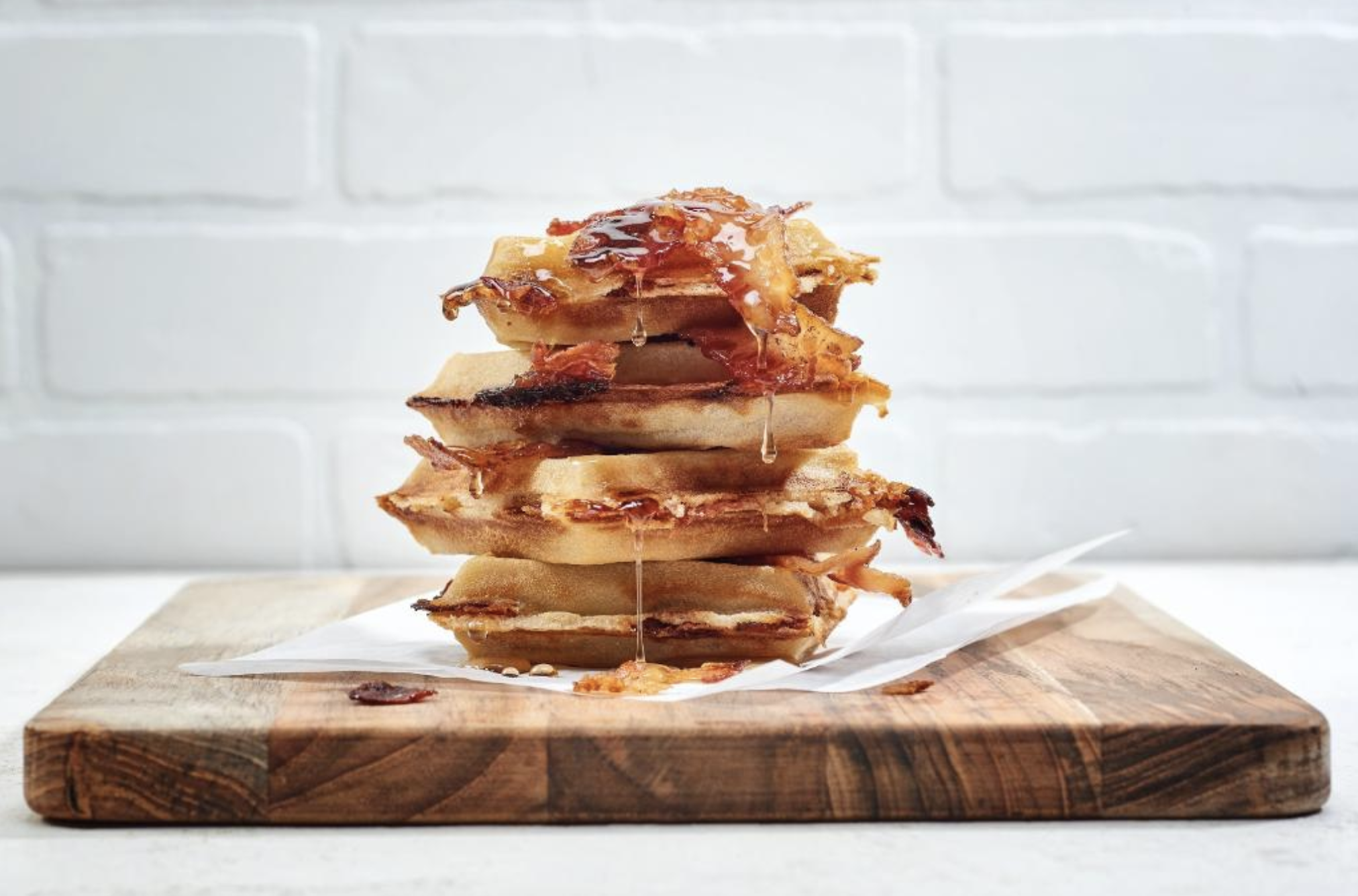 This is a stack of waffles, drizzled in syrup, with pieces of bacon sitting on top. Simple. Easy. And Irresistible. We’re SUPER interested to see if the syrup is bacon flavored!! Aren’t you?
