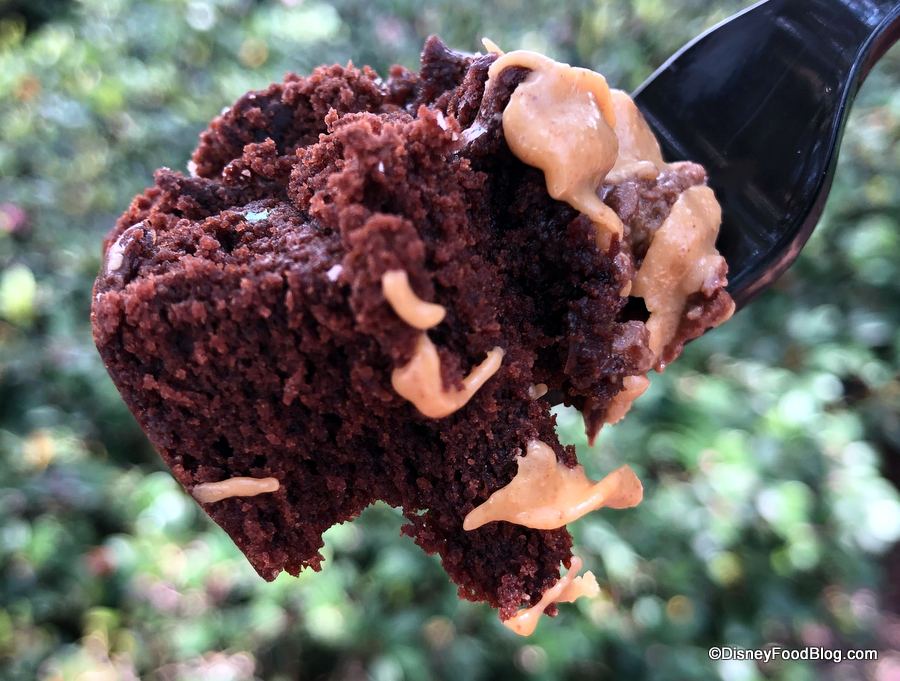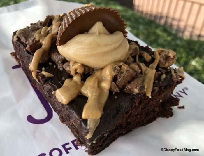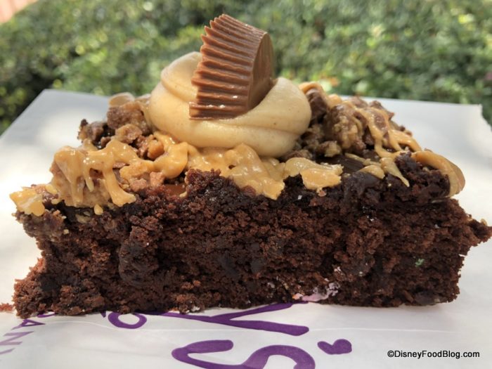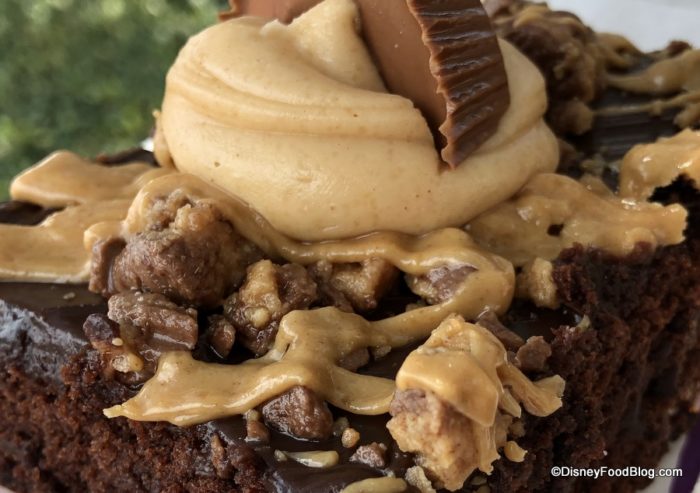 This is a thick, moist-but-crumbly chocolate brownie topped with a little chocolate frosting, a drizzle of peanut butter sauce, and a generous smattering of crumbled Peanut Butter Cups.