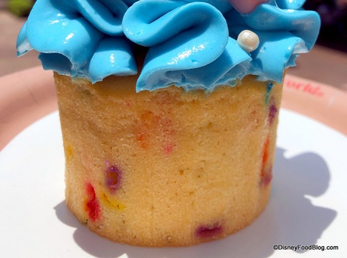 The frosting isn’t standard vanilla tinted blue, though. Because we’re all kids again when we enter the toybox, that blue frosting is cotton candy flavored! And you’ll for sure need to be a fan of that cotton candy flavor to enjoy this cupcake because it dominates.