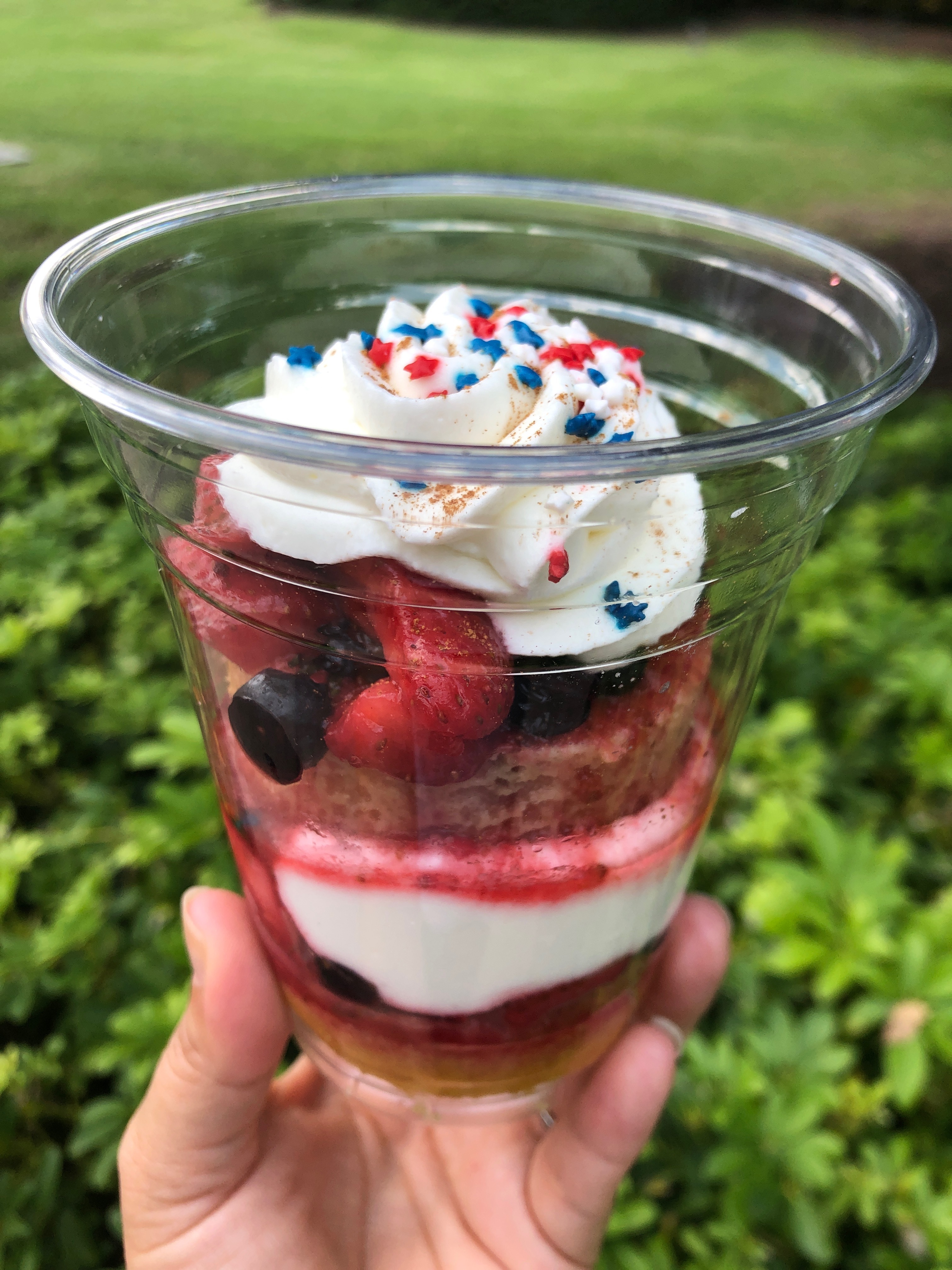 This shortcake has two layers of vanilla cupcake, macerated blueberries and strawberries, whipped cream, and sprinkles!