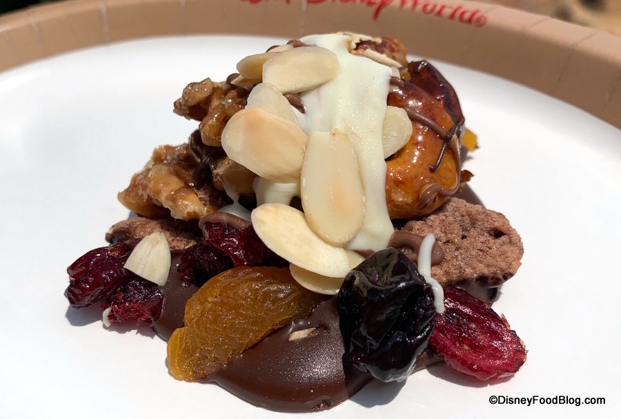 The Chocolate Florentine, as it’s called here, includes several varieties of nuts: sliced almonds, whole almonds, walnuts, and cinnamon-sugar (almond and/or pecan at Walt Disney World). We also spied a few different dried fruits, including cranberries, apricots, and cherries.